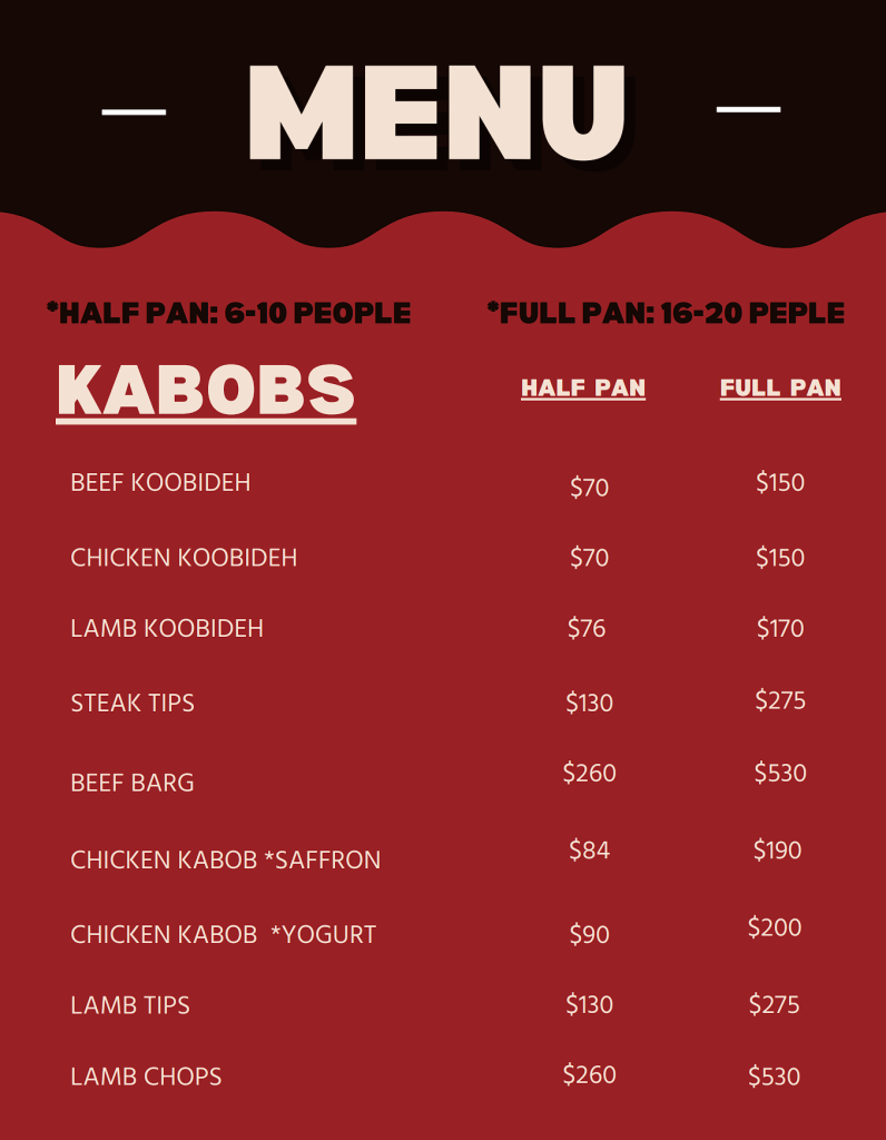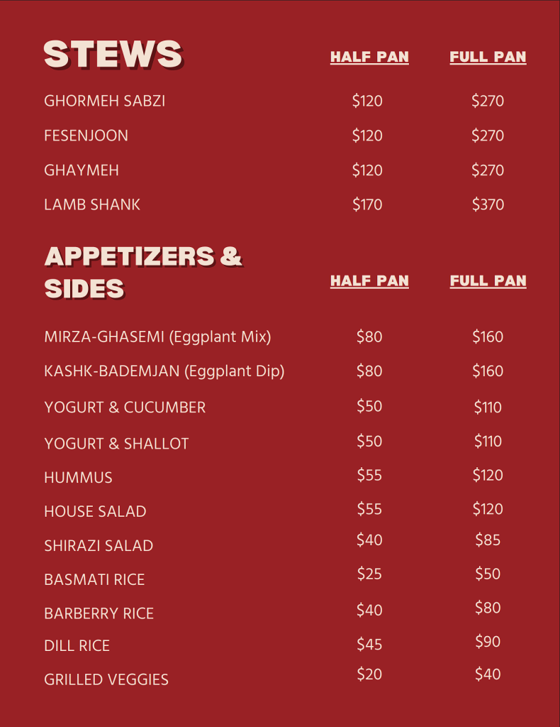 *See our catering menu below for available options. For customized catering orders or special dietary requirements, please contact us at the number provided.